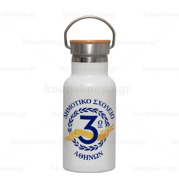 Έμβλημα Σχολικό μπλε, Metallic thermos (Stainless steel) White with wooden lid (bamboo), double-walled, 350ml