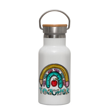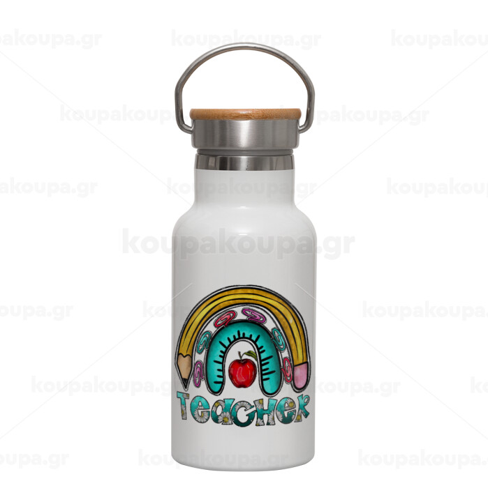 Teacher, Metallic thermos (Stainless steel) White with wooden lid (bamboo), double-walled, 350ml