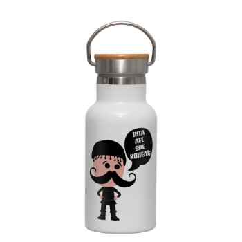 Κρητικός "Ίντα λες ωρέ κοπέλι", Metallic thermos (Stainless steel) White with wooden lid (bamboo), double-walled, 350ml