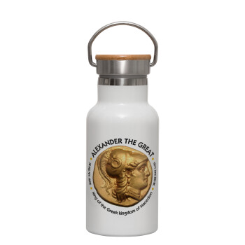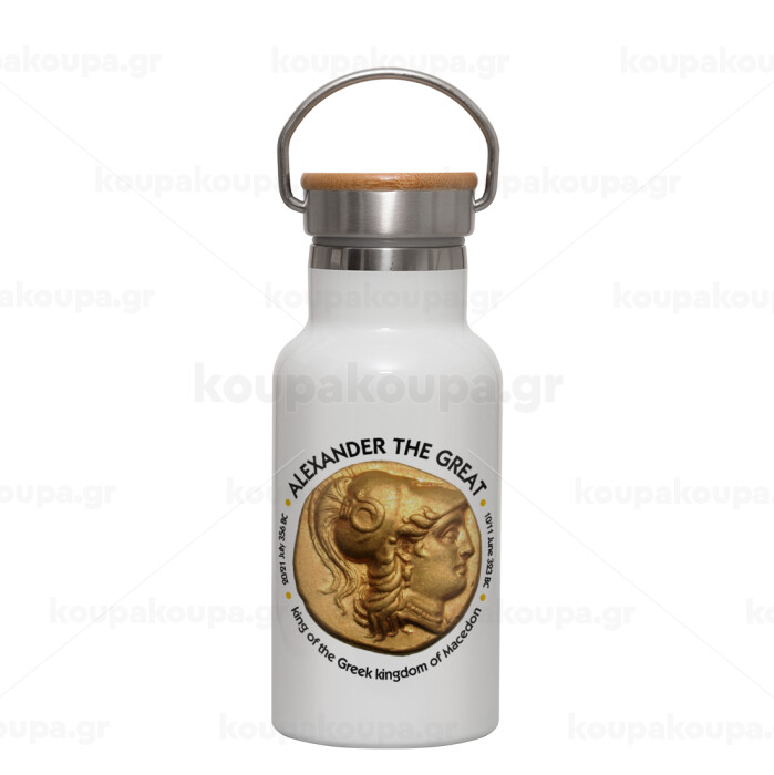 Alexander the Great, Metallic thermos (Stainless steel) White with wooden lid (bamboo), double-walled, 350ml