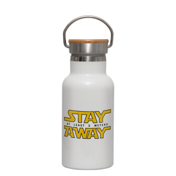 Stay Away, Metallic thermos (Stainless steel) White with wooden lid (bamboo), double-walled, 350ml