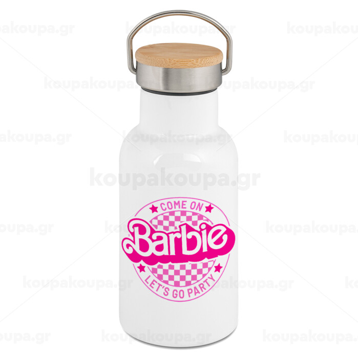 Come On Barbie Lets Go Party , Metallic thermos (Stainless steel) White with wooden lid (bamboo), double-walled, 350ml
