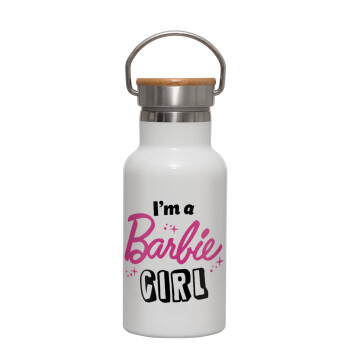 I'm Barbie girl, Metallic thermos (Stainless steel) White with wooden lid (bamboo), double-walled, 350ml