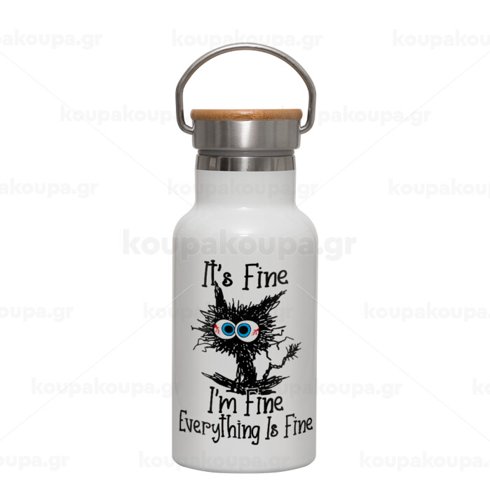 Cat, It's Fine I'm Fine Everything Is Fine, Metallic thermos (Stainless steel) White with wooden lid (bamboo), double-walled, 350ml