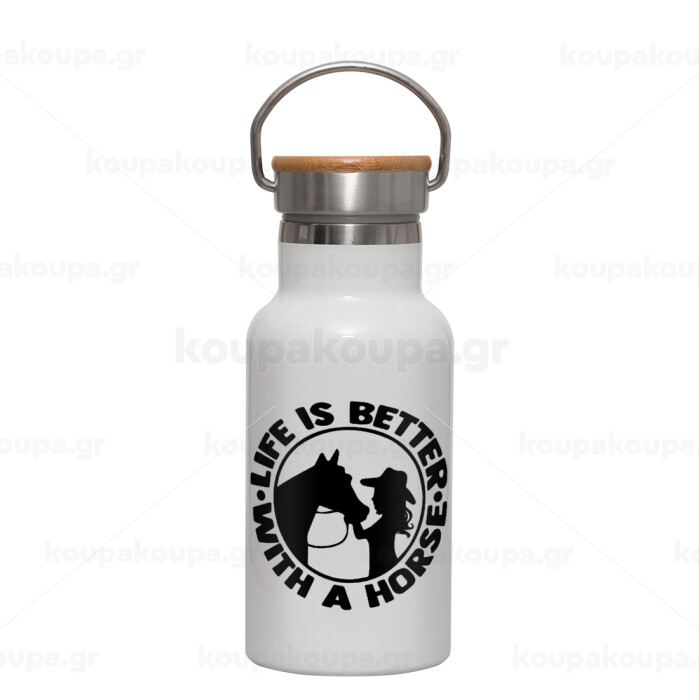 Life is Better with a Horse, Metallic thermos (Stainless steel) White with wooden lid (bamboo), double-walled, 350ml