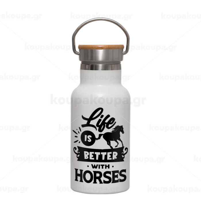 Life is Better with a Horses, Metallic thermos (Stainless steel) White with wooden lid (bamboo), double-walled, 350ml