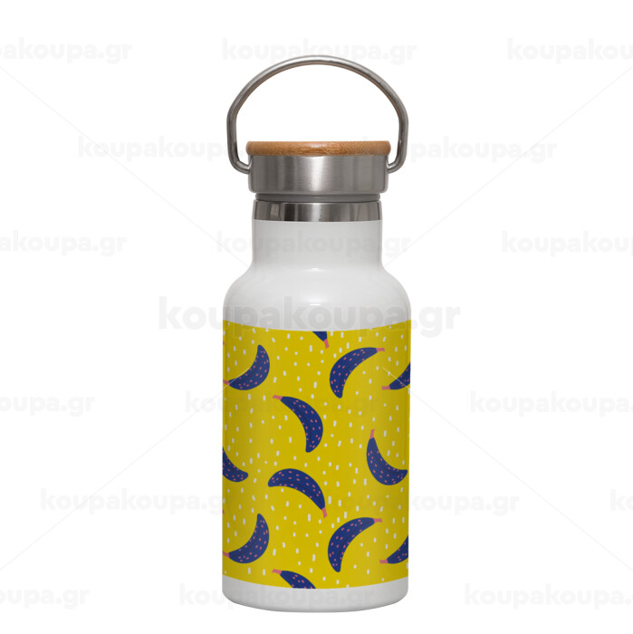 Yellow seamless with blue bananas, Metallic thermos (Stainless steel) White with wooden lid (bamboo), double-walled, 350ml