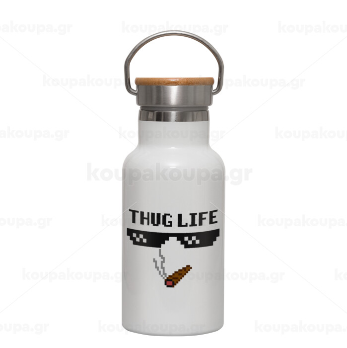 thug life, Metallic thermos (Stainless steel) White with wooden lid (bamboo), double-walled, 350ml