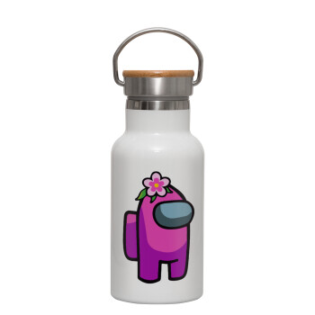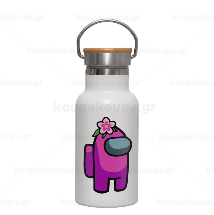 Among US girl, Metallic thermos (Stainless steel) White with wooden lid (bamboo), double-walled, 350ml