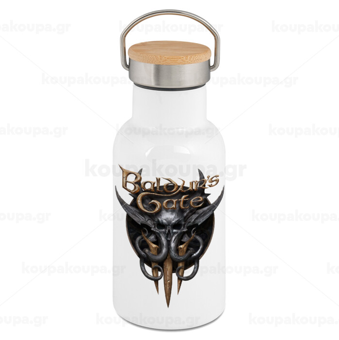 Baldur's Gate, Metallic thermos (Stainless steel) White with wooden lid (bamboo), double-walled, 350ml