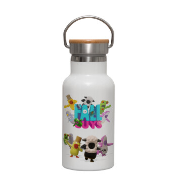 FALL GUYS, Metallic thermos (Stainless steel) White with wooden lid (bamboo), double-walled, 350ml