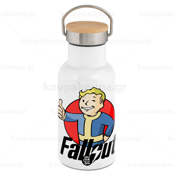 Fallout Vault Boy, Metallic thermos (Stainless steel) White with wooden lid (bamboo), double-walled, 350ml