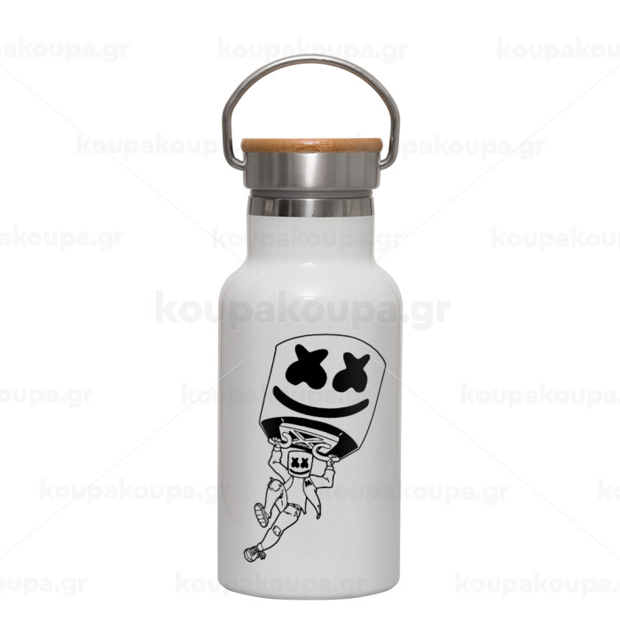 Fortnite Marshmello, Metallic thermos (Stainless steel) White with wooden lid (bamboo), double-walled, 350ml