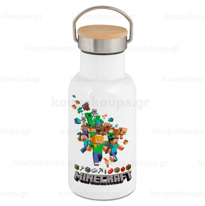 Minecraft adventure, Metallic thermos (Stainless steel) White with wooden lid (bamboo), double-walled, 350ml