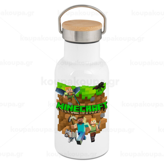 Minecraft characters, Metallic thermos (Stainless steel) White with wooden lid (bamboo), double-walled, 350ml