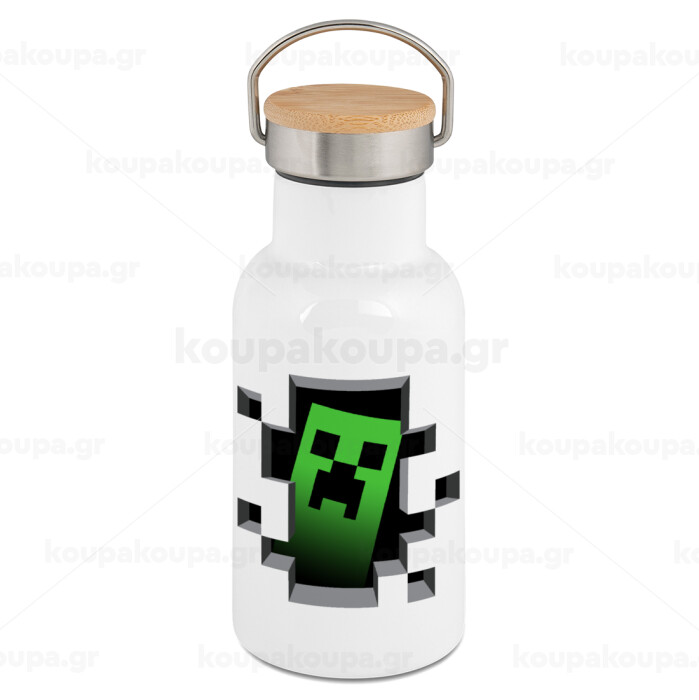 Minecraft creeper, Metallic thermos (Stainless steel) White with wooden lid (bamboo), double-walled, 350ml