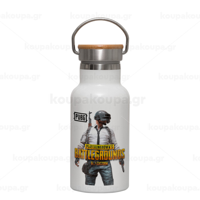 PUBG battleground royale, Metallic thermos (Stainless steel) White with wooden lid (bamboo), double-walled, 350ml