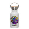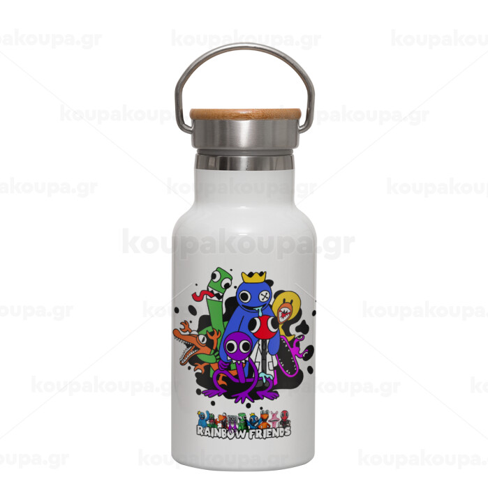 Rainbow friends, Metallic thermos (Stainless steel) White with wooden lid (bamboo), double-walled, 350ml