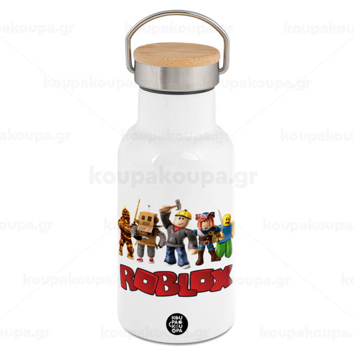 Roblox squad, Metallic thermos (Stainless steel) White with wooden lid (bamboo), double-walled, 350ml