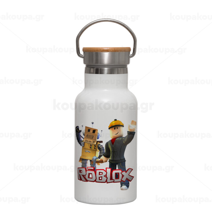 Roblox, Metallic thermos (Stainless steel) White with wooden lid (bamboo), double-walled, 350ml