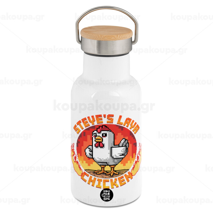 Steve's Lava Chicken, Metallic thermos (Stainless steel) White with wooden lid (bamboo), double-walled, 350ml