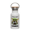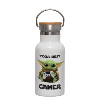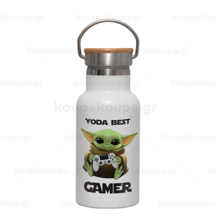 Yoda Best Gamer, Metallic thermos (Stainless steel) White with wooden lid (bamboo), double-walled, 350ml