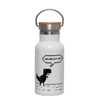You are offline dinosaur, Metallic thermos (Stainless steel) White with wooden lid (bamboo), double-walled, 350ml