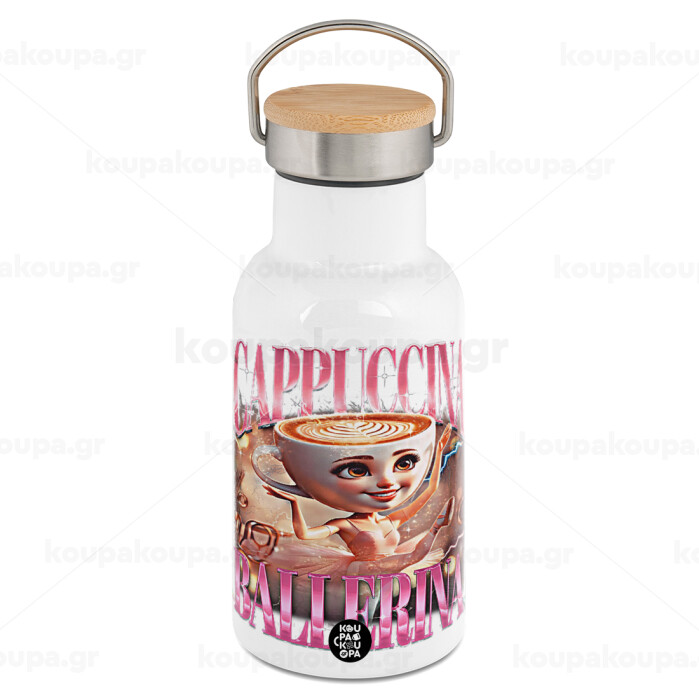 BALLERINA CAPUCHINA FUNK, Metallic thermos (Stainless steel) White with wooden lid (bamboo), double-walled, 350ml