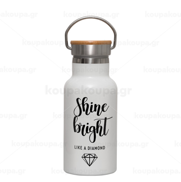 Bright, Shine like a Diamond, Metallic thermos (Stainless steel) White with wooden lid (bamboo), double-walled, 350ml