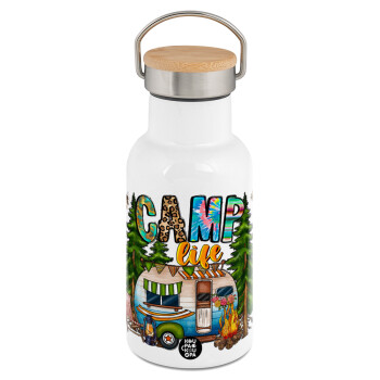 Camp Life, Metallic thermos (Stainless steel) White with wooden lid (bamboo), double-walled, 350ml
