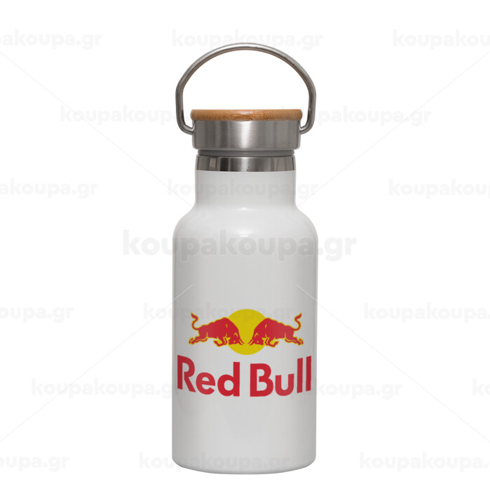 Redbull, Metallic thermos (Stainless steel) White with wooden lid (bamboo), double-walled, 350ml