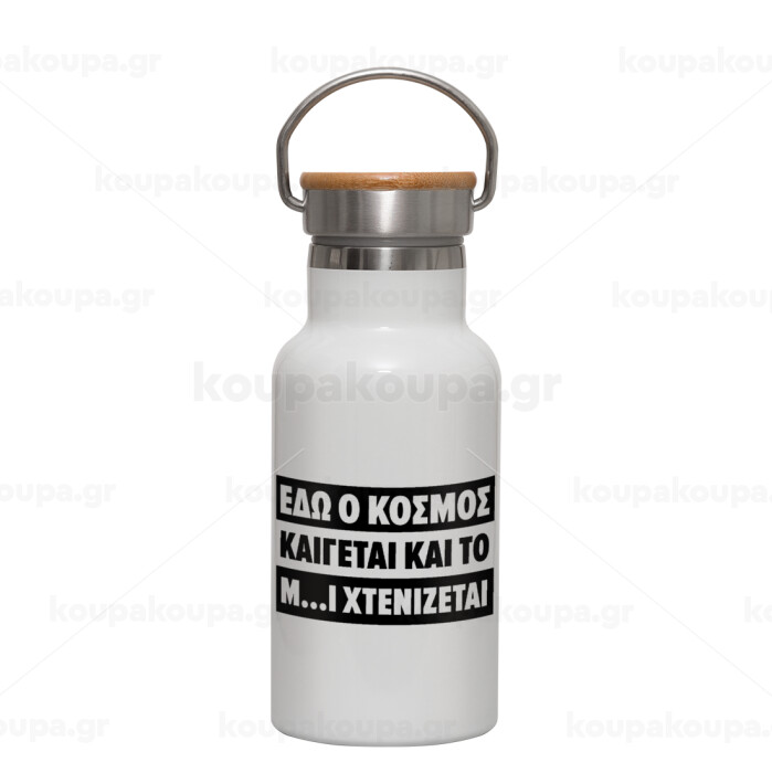 Εδώ ο κόσμος καίγεται και το Μ....Ι χτενίζεται, Metallic thermos (Stainless steel) White with wooden lid (bamboo), double-walled, 350ml