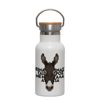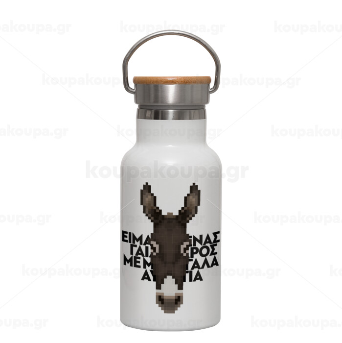 Είμαι ένας γάιδαρος με μεγάλα αυτιά., Metallic thermos (Stainless steel) White with wooden lid (bamboo), double-walled, 350ml