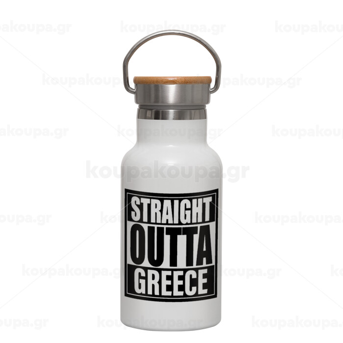 Straight Outta greece, Metallic thermos (Stainless steel) White with wooden lid (bamboo), double-walled, 350ml
