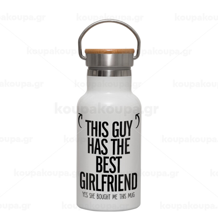 This guy has the best Girlfriend, Metallic thermos (Stainless steel) White with wooden lid (bamboo), double-walled, 350ml