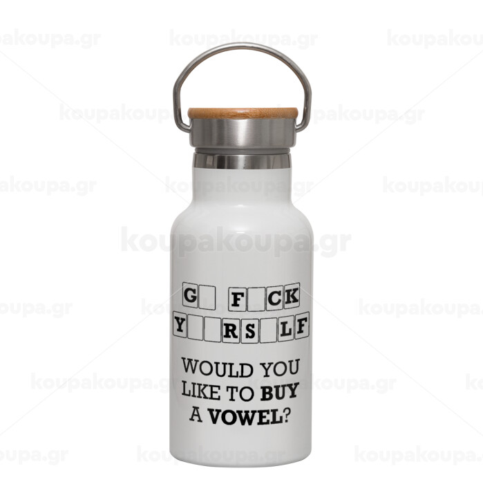 Wheel of fortune, go f..k yourself, Metallic thermos (Stainless steel) White with wooden lid (bamboo), double-walled, 350ml