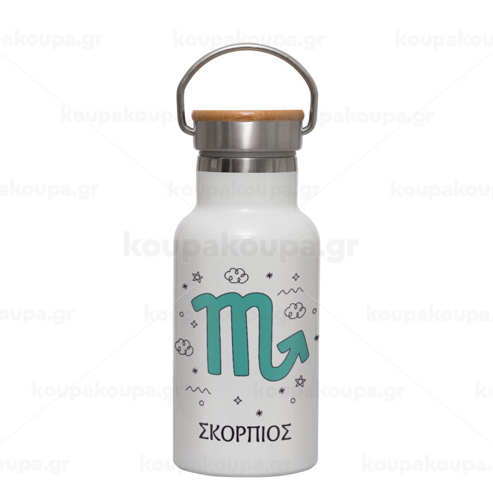 Ζώδια Σκορπιός, Metallic thermos (Stainless steel) White with wooden lid (bamboo), double-walled, 350ml