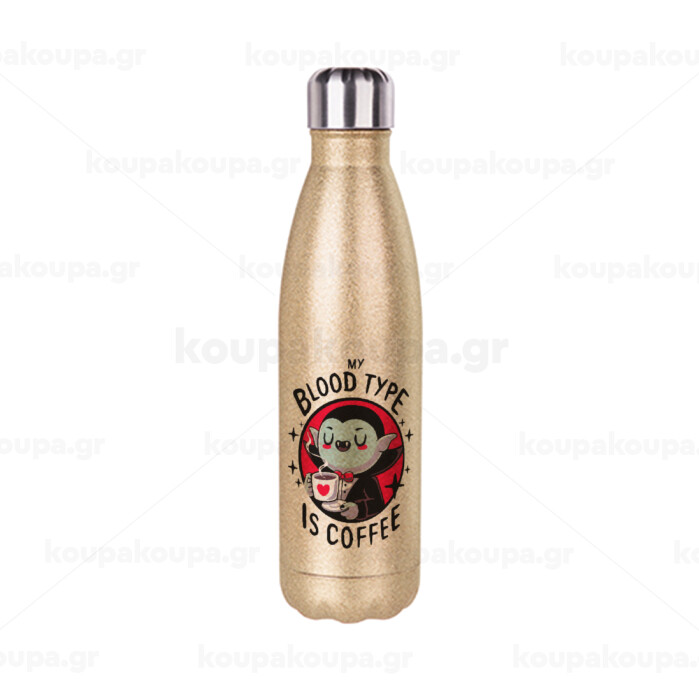 My blood type is coffee, Glitter gold stainless steel thermos bottle, double-walled, 500ml