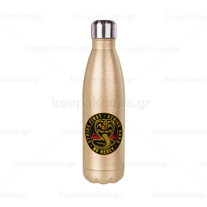 cobra kai strike first dojo, Glitter gold stainless steel thermos bottle, double-walled, 500ml