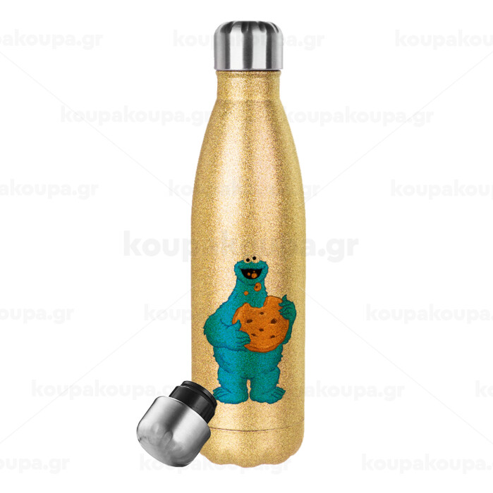 Cookie Monster, Glitter gold stainless steel thermos bottle, double-walled, 500ml