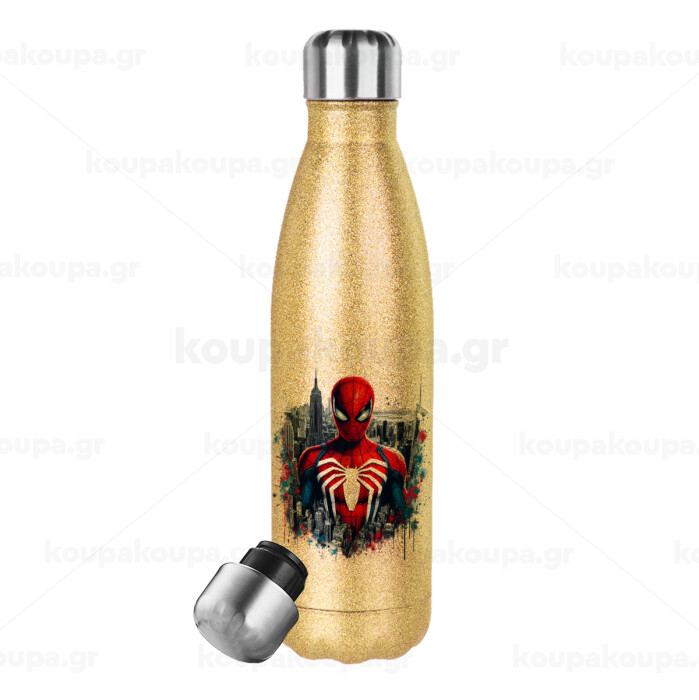 Spiderman City, Glitter gold stainless steel thermos bottle, double-walled, 500ml