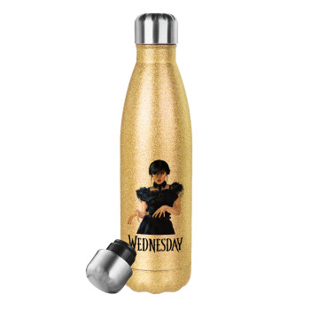 Wednesday Adams, dance with hands, Glitter gold stainless steel thermos bottle, double-walled, 500ml