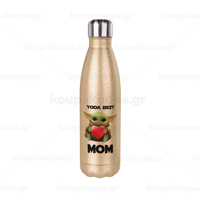 Yoda Best mom, Glitter gold stainless steel thermos bottle, double-walled, 500ml