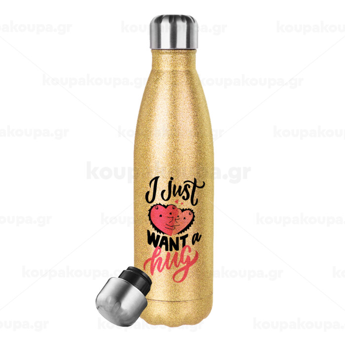 I Just want a hug!, Glitter gold stainless steel thermos bottle, double-walled, 500ml