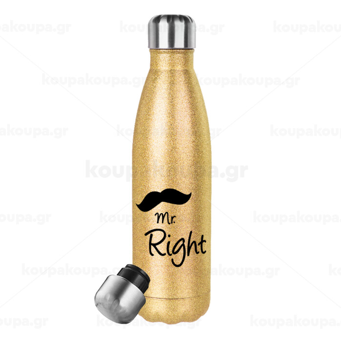 Mr right Mustache, Glitter gold stainless steel thermos bottle, double-walled, 500ml