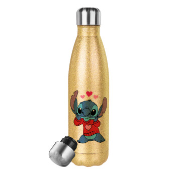 Stitch heart, Glitter gold stainless steel thermos bottle, double-walled, 500ml