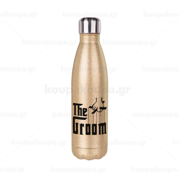 The Groom, Glitter gold stainless steel thermos bottle, double-walled, 500ml