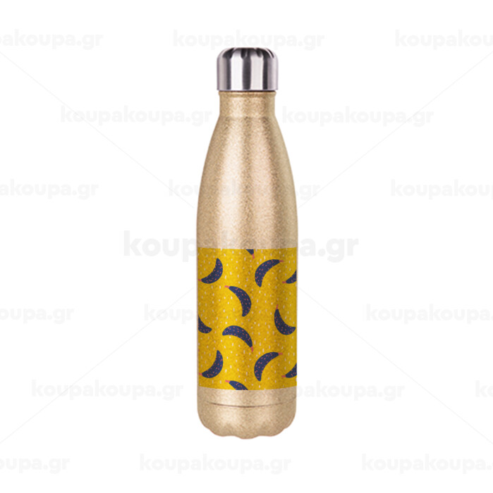 Yellow seamless with blue bananas, Glitter gold stainless steel thermos bottle, double-walled, 500ml