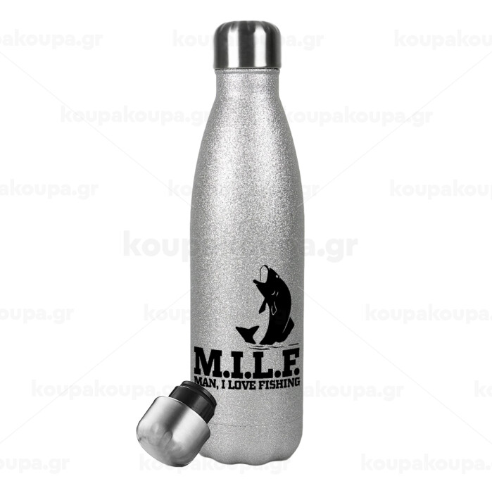 M.I.L.F. Mam i love fishing, Metallic Glitter Silver Thermos Flask (Stainless steel), double-walled, 500ml