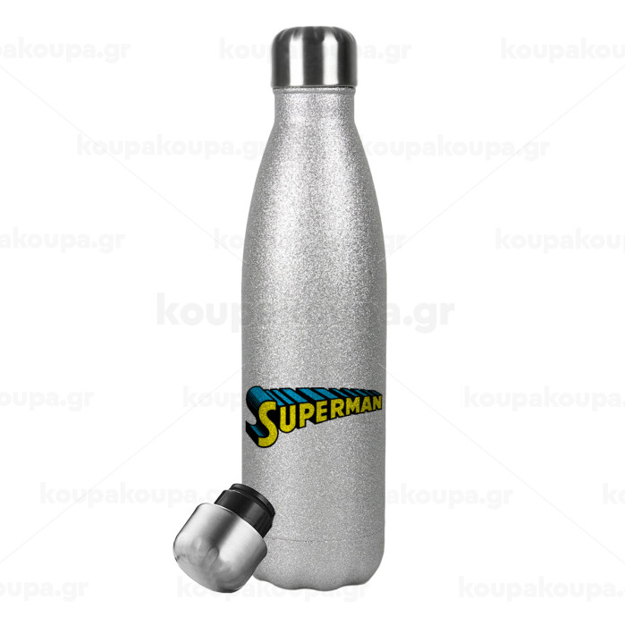 Superman vintage, Metallic Glitter Silver Thermos Flask (Stainless steel), double-walled, 500ml
